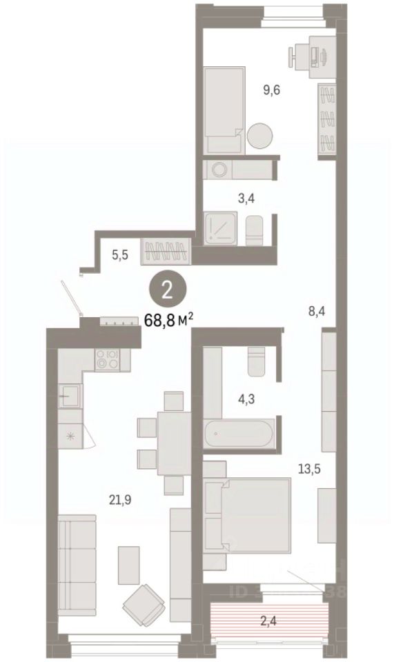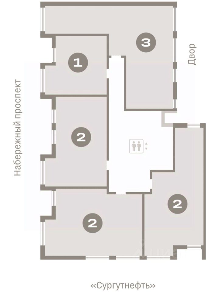 Квартира с кухней-гостиной и двумя спальнями в квартале "Нефть". Особенности планировки: окна на две стороны, гардеробная, вид во двор, лоджия, разнесённые спальни, предчистовая отделка, мастер-спальня.