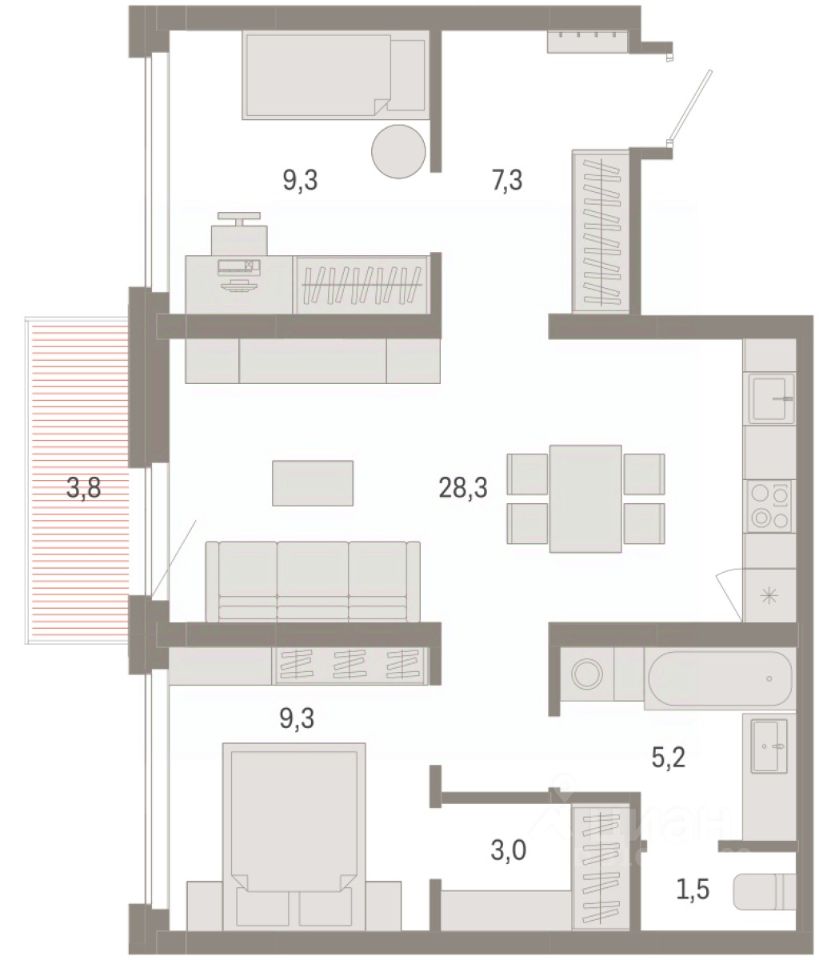 Квартира с кухней-гостиной и двумя спальнями в квартале "Нефть". Особенности планировки: гардеробная, вид во двор, разнесённые спальни, предчистовая отделка, балкон.
