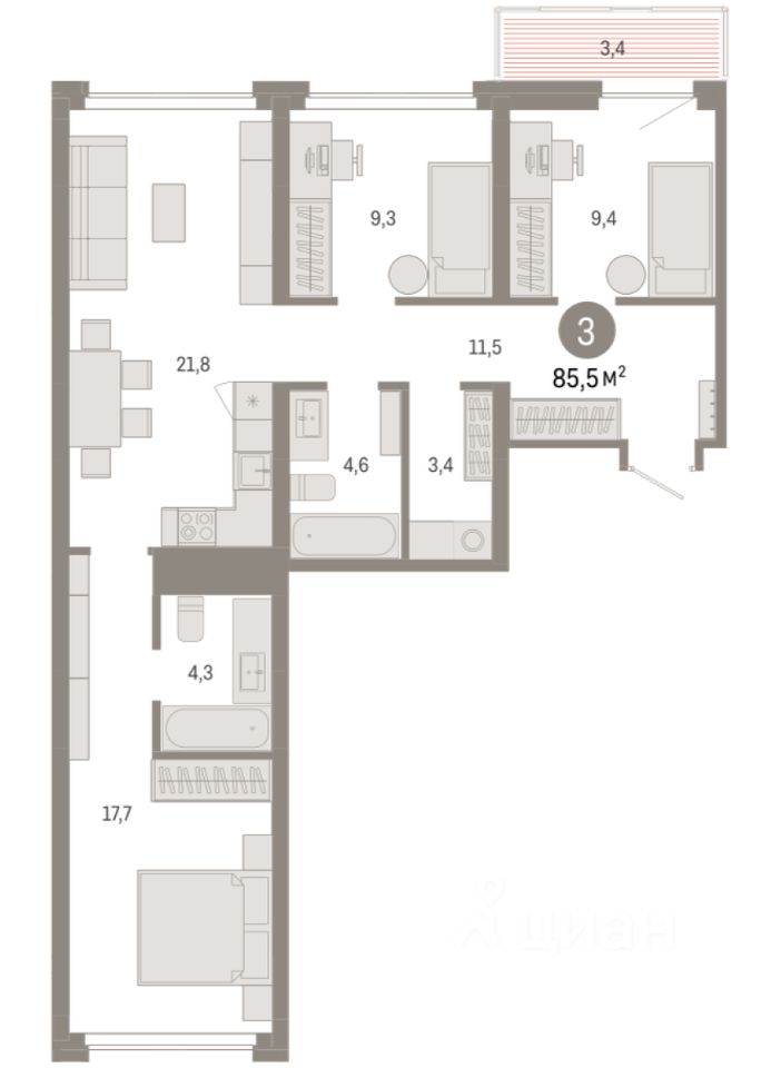 Квартира с кухней-гостиной и тремя спальнями в квартале "Нефть". Особенности планировки: окна на две стороны, гардеробная, вид во двор, разнесённые спальни, предчистовая отделка, мастер-спальня, постирочная, балкон.