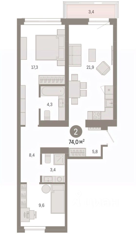 Квартира с кухней-гостиной и двумя спальнями в квартале "Нефть". Особенности планировки: окна на две стороны, гардеробная, вид во двор, разнесённые спальни, предчистовая отделка, мастер-спальня, балкон.
