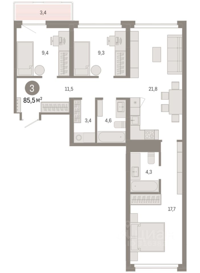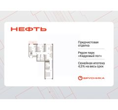 Квартира с кухней-гостиной и тремя спальнями в квартале "Нефть". Особенности планировки: балкон, вид во двор, гардеробная, мастер-спальня, окна на две стороны, постирочная, предчистовая отделка, разнесённые спальни.