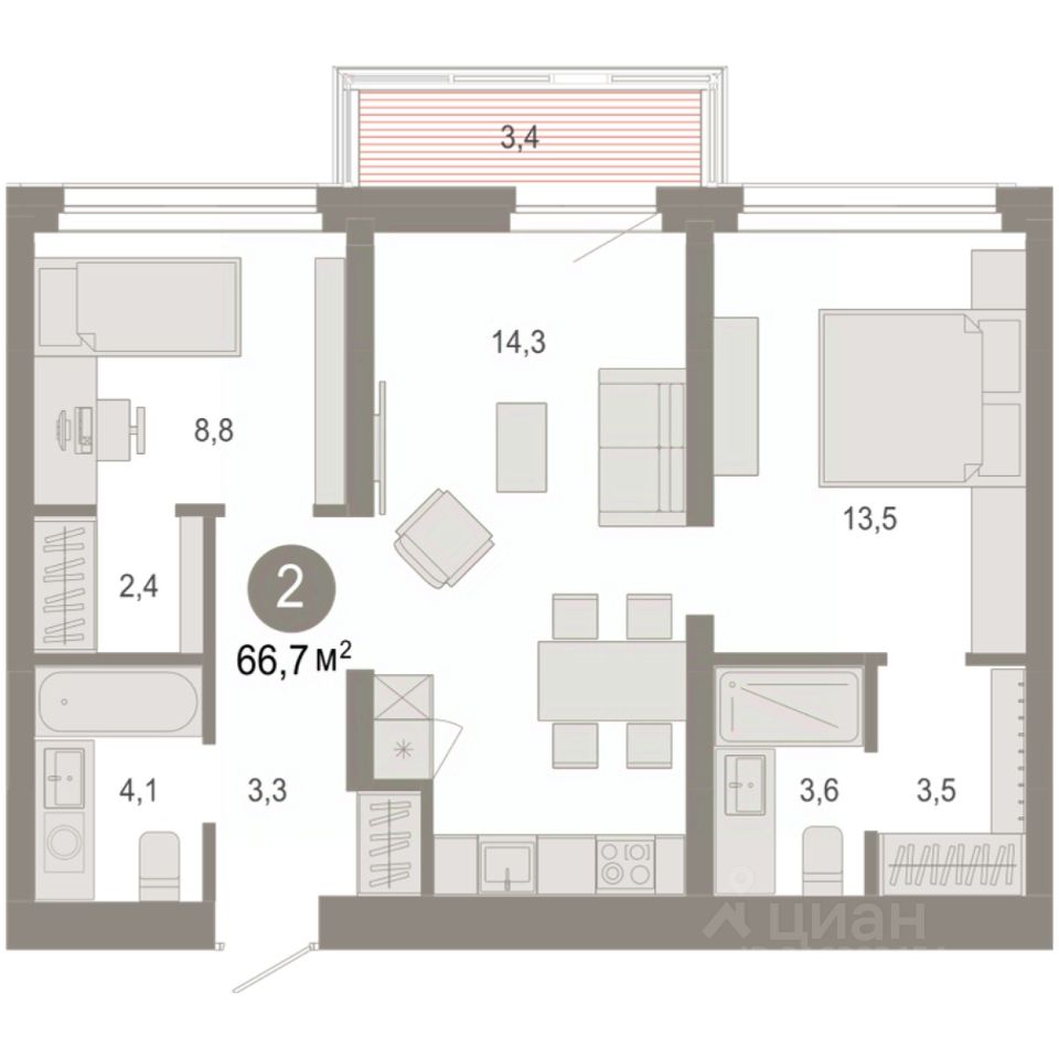 Продается двухкомнатная квартира с предчистовой отделкой в ЖК "Нефть" на 6 этаже. Общая площадь: 66.73 кв.м., жилая: 22.3 кв.м., площадь просторной кухни-гостиной: 20.8 кв.м. Комнаты изолированные, все окна выходят на одну сторону. В квартире один балкон, два совмещенных санузла. Высота потолков 2.7 м.