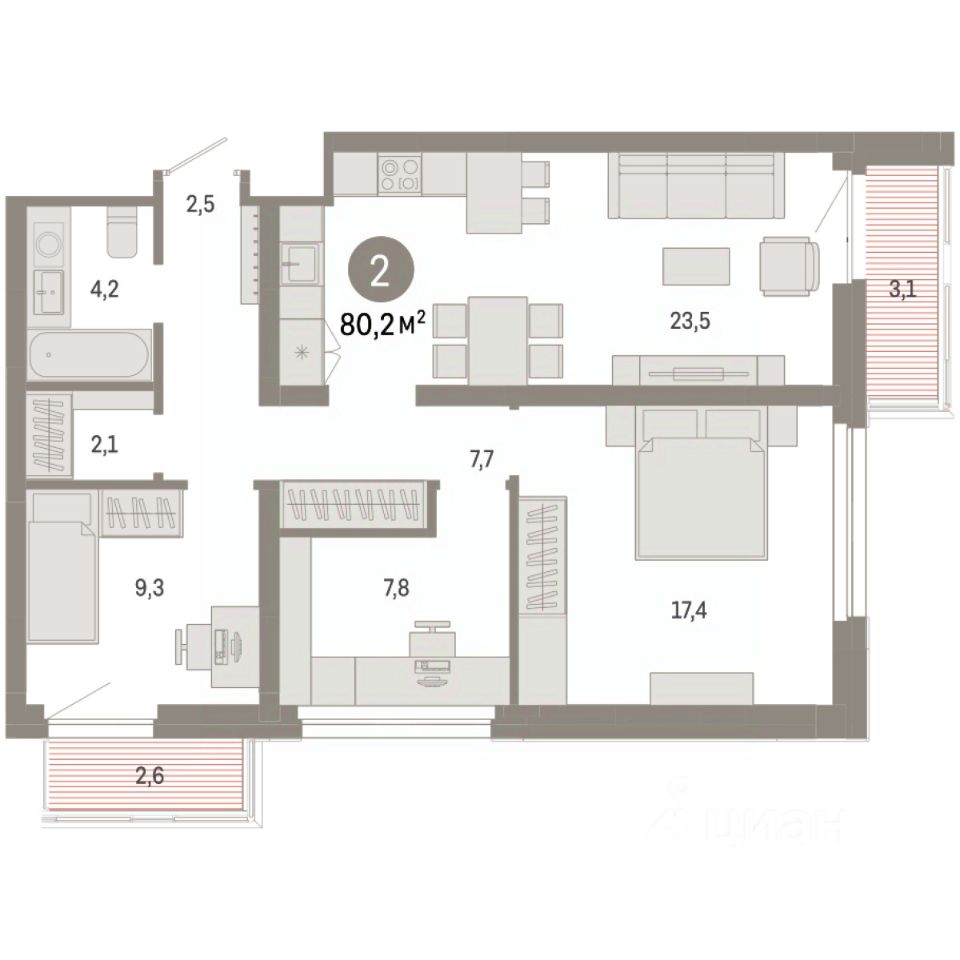 Квартира с кухней-гостиной и двумя спальнями в квартале "Нефть". Особенности планировки: гардеробная, рабочий кабинет, лоджия, разнесённые спальни, предчистовая отделка, балкон.