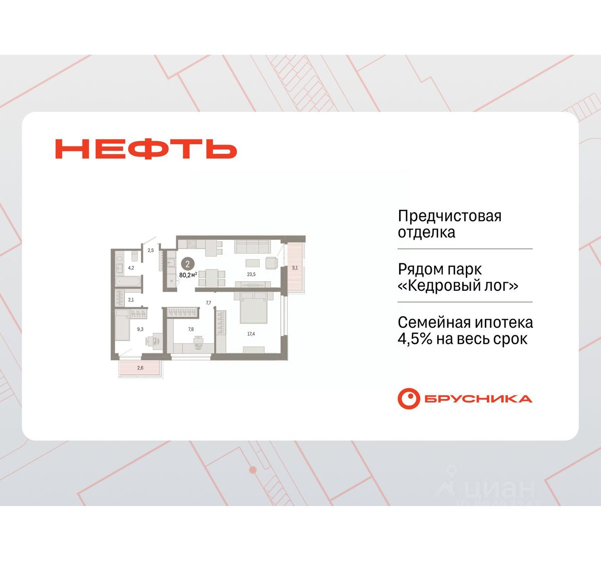 Просторная двухкомнатная квартира с предчистовой отделкой в ЖК "Нефть" на 7 этаже. Общая площадь: 80.16 кв.м., жилая: 26.7 кв.м., площадь просторной кухни-гостиной: 23.5 кв.м. Угловая квартира, очень светлая, естественная вентиляция при открытии окон. В квартире два балкона, один совмещенный санузел. Высота потолков 2.7 м.