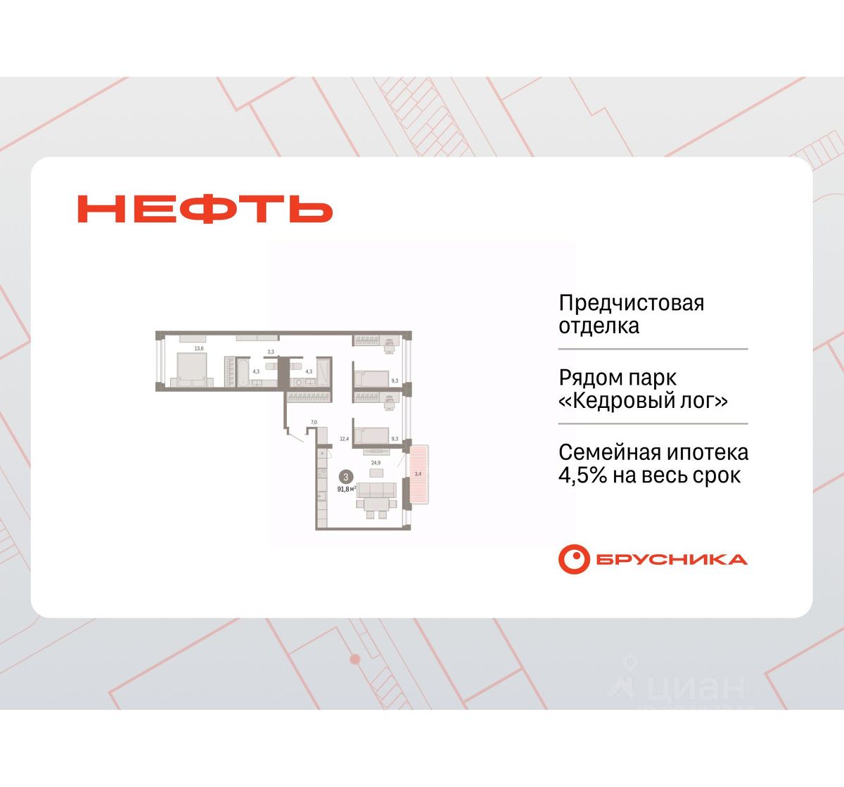 Трехкомнатная квартира от застройщика с предчистовой отделкой в ЖК "Нефть" на 6 этаже. Общая площадь: 91.83 кв.м., жилая: 32.2 кв.м., площадь просторной кухни-гостиной: 24.9 кв.м. Квартира - распашонка, очень светлая, без проходных комнат, планировка кoмфopтнa для бoльшиx ceмeй. В квартире один балкон, два совмещенных санузла. Высота потолков 2.7 м.