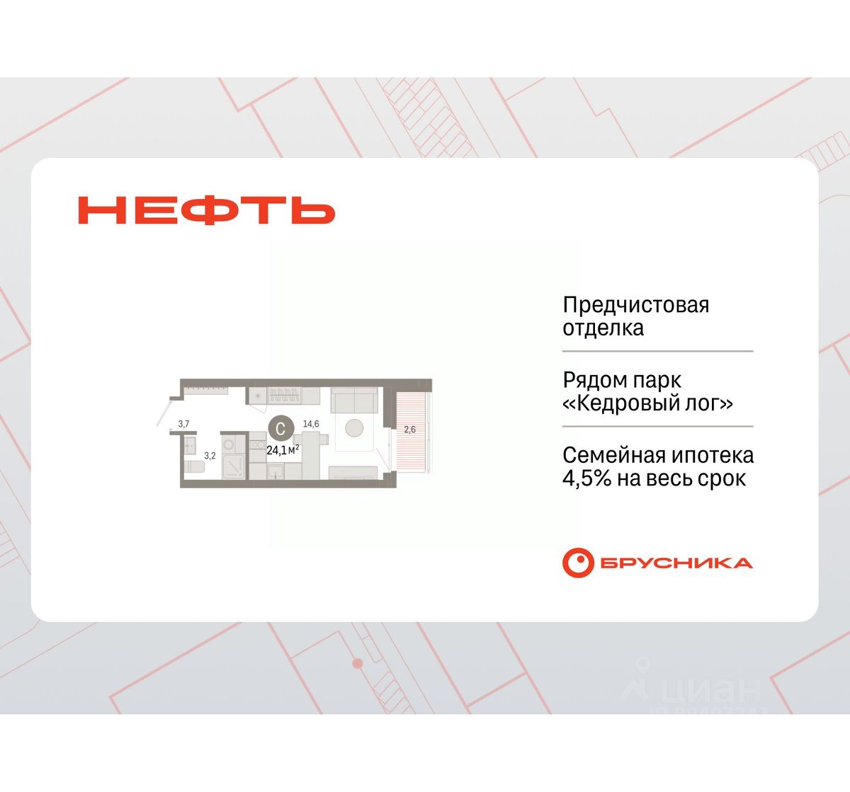1-комн. студия с предчистовой отделкой в ЖК "Нефть" на 6 этаже. Общая площадь: 24.05 кв.м., площадь гостиной 14.6 кв.м., из которых 5 кв.м. выделено под кухонную зону. Все окна выходят на одну сторону. В квартире один балкон, один совмещенный санузел. Высота потолков 2.7 м.