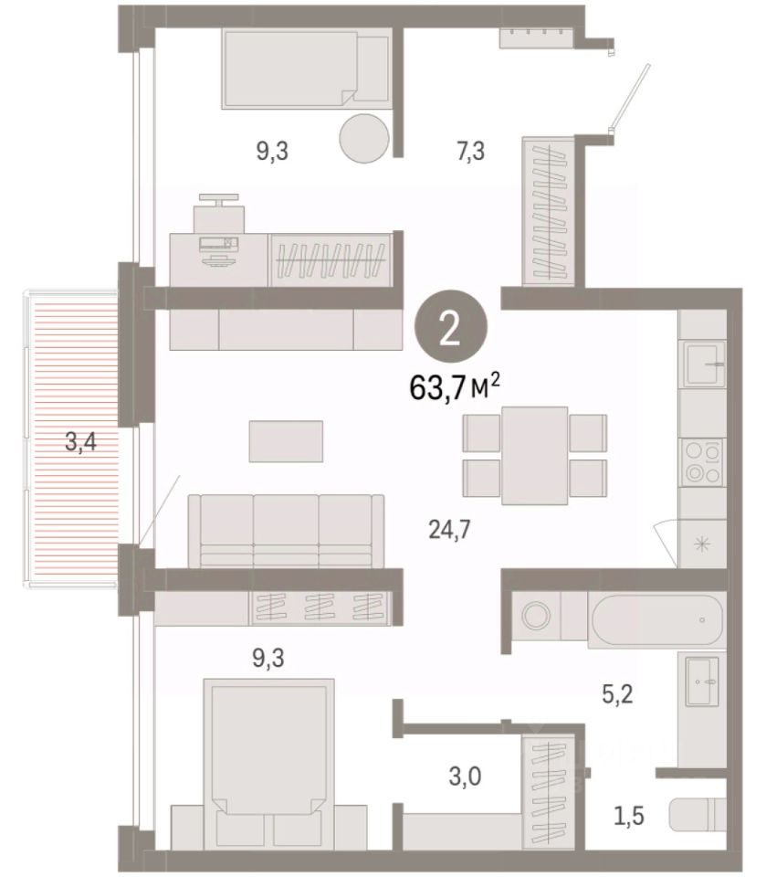 Двухкомнатная квартира от застройщика с предчистовой отделкой в ЖК "Нефть" на 3 этаже. Общая площадь: 63.73 кв.м., жилая: 18.6 кв.м., площадь просторной кухни-гостиной: 24.7 кв.м. Комнаты изолированные, все окна выходят на одну сторону. В квартире один балкон, один совмещенный санузел. Высота потолков 2.7 м.