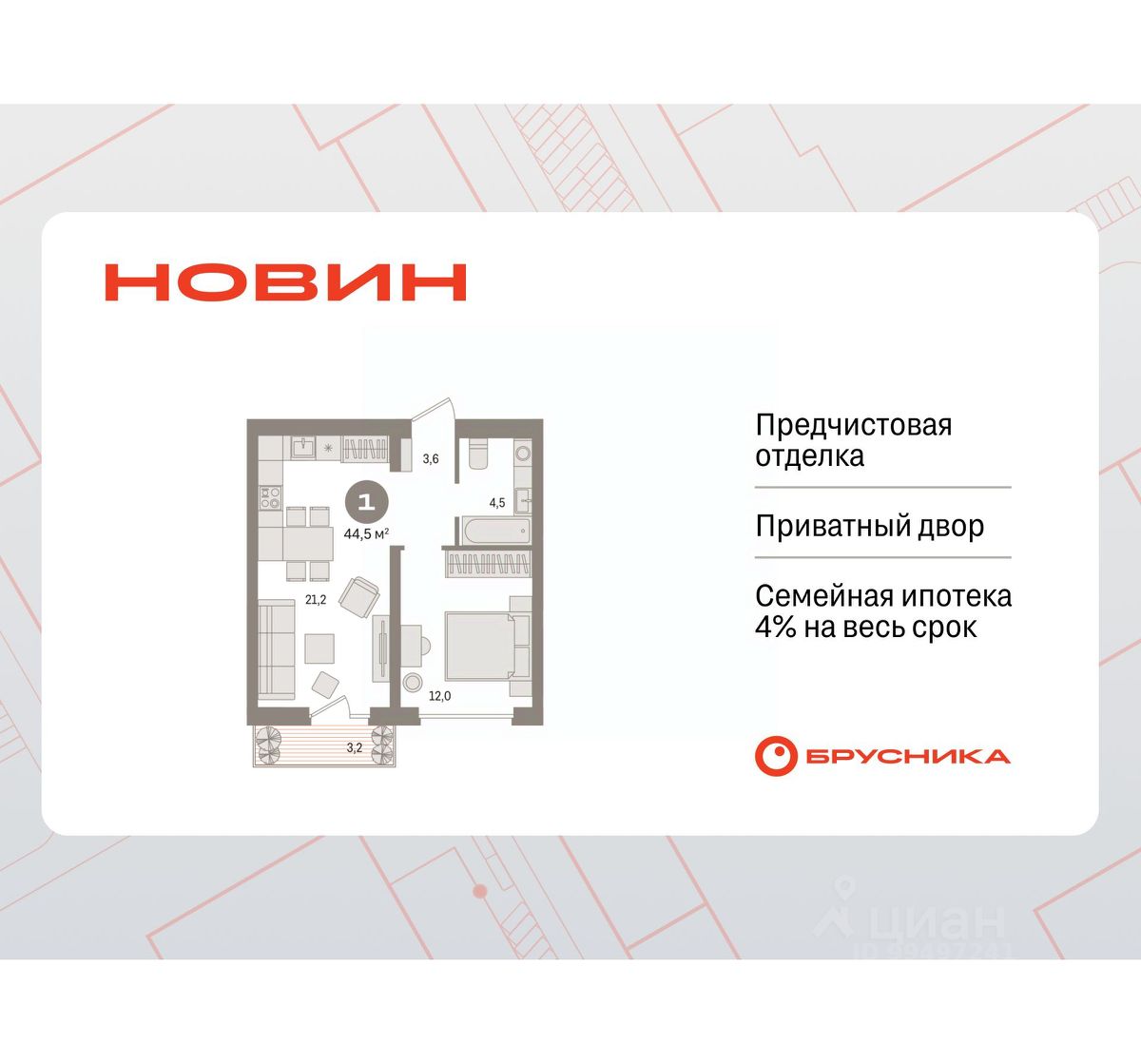 Продается 1-комн. квартира с предчистовой отделкой в ЖК "Новин" на 5 этаже. Общая площадь: 44.52 кв.м., жилая: 12 кв.м., площадь просторной кухни-гостиной: 21.2 кв.м. Все окна выходят на одну сторону. В квартире один балкон, один совмещенный санузел. Высота потолков 2.7 м.