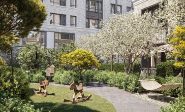 В проекте выражена идея интровертности здания: стены дома устроены вокруг внутреннего двора, который находится в центре композиции. Также здесь расположены две пешеходные арки, через которые осуществляется сквозной доступ во двор с улицы и главный вход в здание. Двор носит полуприватный характер и становится камерным лобби для жителей и гостей. Он полностью закрыт от машин. Во дворе высажены уже взрослые деревья, кустарники, цветы и злаковые травы, постелен газон. Растения размещены в грунте и дополнительно расставлены в вазонах. Во дворе предусмотрены места отдыха и прогулочные дорожки. Рядом с домом спроектирована большая детская площадка для детей разных возрастов с лестницами, горками и качелями, установлены уличные тренажёры для воркаута. #IEBD7g