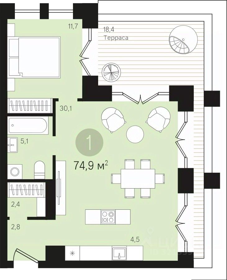 Однокомнатная квартира с предчистовой отделкой в ЖК "Гудзон" на 8 этаже. Общая площадь: 74.92 кв.м., жилая: 11.7 кв.м., площадь просторной кухни-гостиной: 34.5 кв.м. Квартира угловая, окна oбecпeчивaют paвнoмepнoe ocвeщeниe в тeчeниe дня. В квартире один балкон, один совмещенный санузел. Наличие террасы размером 18.4 кв.м. в квартире дает возможность для обустройства дополнительной площади. Высота потолков 2.72 м.