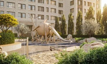 В проекте выражена идея интровертности здания: стены дома устроены вокруг внутреннего двора, который находится в центре композиции. Также здесь расположены две пешеходные арки, через которые осуществляется сквозной доступ во двор с улицы и главный вход в здание. Двор носит полуприватный характер и становится камерным лобби для жителей и гостей. Он полностью закрыт от машин. Во дворе высажены уже взрослые деревья, кустарники, цветы и злаковые травы, постелен газон. Растения размещены в грунте и дополнительно расставлены в вазонах. Во дворе предусмотрены места отдыха и прогулочные дорожки. Рядом с домом спроектирована большая детская площадка для детей разных возрастов с лестницами, горками и качелями, установлены уличные тренажёры для воркаута. #IeBdgE