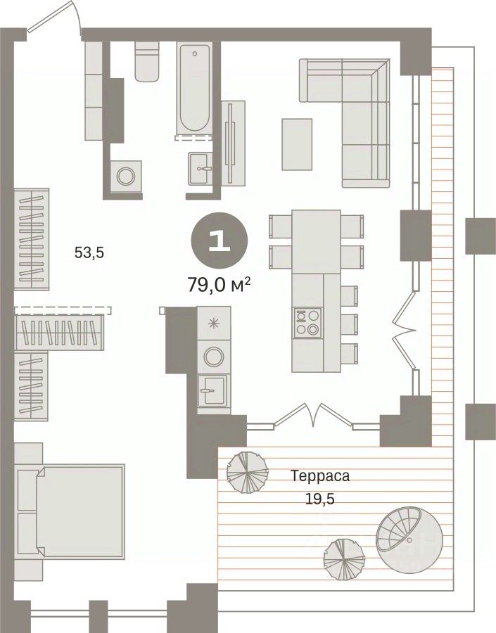 1-комн. квартира с предчистовой отделкой в ЖК "Гудзон" на 8 этаже. Общая площадь: 79 кв.м., жилая: 48.2 кв.м., площадь кухни: 5.3 кв.м. Квартира угловая, окна oбecпeчивaют paвнoмepнoe ocвeщeниe в тeчeниe дня. В квартире один балкон, один совмещенный санузел. Терраса площадью 19.5 кв.м. представляет собой роскошную зону отдыха для проведение вечеров в кругу семьи и друзей или организация вечеринок. Высота потолков 2.72 м.