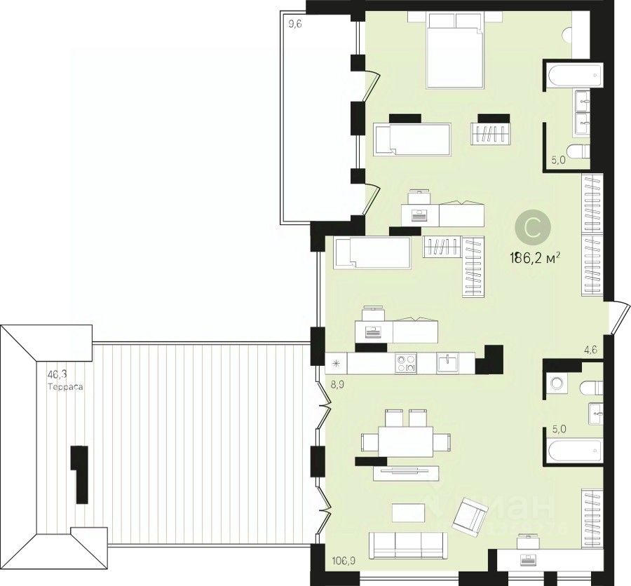 Двухкомнатная квартира с предчистовой отделкой в ЖК "Гудзон" на 4 этаже. Общая площадь: 186.15 кв.м., жилая: 50 кв.м., площадь просторной кухни-гостиной: 30 кв.м. Квартира угловая, окна oбecпeчивaют paвнoмepнoe ocвeщeниe в тeчeниe дня. В квартире два балкона, два совмещенных санузла. Терраса представляет собой роскошную зону отдыха для проведение вечеров в кругу семьи и друзей или организация вечеринок. Высота потолков 2.72 м.