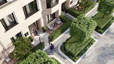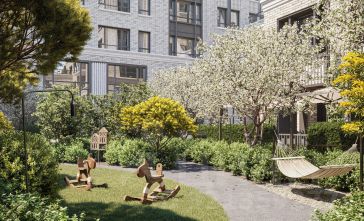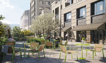В проекте выражена идея интровертности здания: стены дома устроены вокруг внутреннего двора, который находится в центре композиции. Также здесь расположены две пешеходные арки, через которые осуществляется сквозной доступ во двор с улицы и главный вход в здание. Двор носит полуприватный характер и становится камерным лобби для жителей и гостей. Он полностью закрыт от машин. Во дворе высажены уже взрослые деревья, кустарники, цветы и злаковые травы, постелен газон. Растения размещены в грунте и дополнительно расставлены в вазонах. Во дворе предусмотрены места отдыха и прогулочные дорожки. Рядом с домом спроектирована большая детская площадка для детей разных возрастов с лестницами, горками и качелями, установлены уличные тренажёры для воркаута. #2ZUAoI