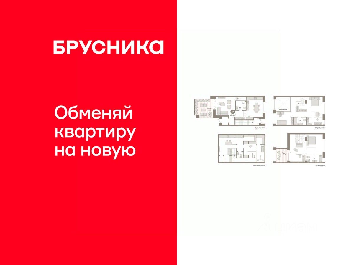 Продается трехкомнатная квартира с предчистовой отделкой в ЖК "Гудзон" на 1 этаже. 4-уровневая квартира, планировка позволяет организовать индивидуальное пространство для каждого члена семьи. Общая площадь: 253.28 кв.м., жилая: 90 кв.м., площадь просторной кухни-гостиной: 20 кв.м. Комнаты изолированные, все окна выходят на одну сторону. В квартире два балкона, три совмещенных санузла. Наличие террасы в квартире открывает возможность для создания зон отдыха в кругу семьи и друзей. Высота потолков 2.72 м.