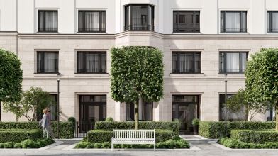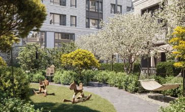 В проекте выражена идея интровертности здания: стены дома устроены вокруг внутреннего двора, который находится в центре композиции. Также здесь расположены две пешеходные арки, через которые осуществляется сквозной доступ во двор с улицы и главный вход в здание. Двор носит полуприватный характер и становится камерным лобби для жителей и гостей. Он полностью закрыт от машин. Во дворе высажены уже взрослые деревья, кустарники, цветы и злаковые травы, постелен газон. Растения размещены в грунте и дополнительно расставлены в вазонах. Во дворе предусмотрены места отдыха и прогулочные дорожки. Рядом с домом спроектирована большая детская площадка для детей разных возрастов с лестницами, горками и качелями, установлены уличные тренажёры для воркаута. #Z491gB