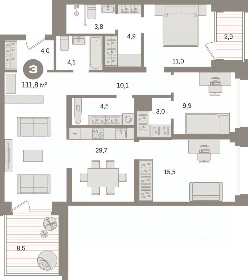 3-комн. квартира с предчистовой отделкой в ЖК "Гудзон" на 3 этаже. Общая площадь: 111.83 кв.м., жилая: 36.4 кв.м., площадь просторной кухни-гостиной: 29.7 кв.м. Комнаты изолированные, все окна выходят на одну сторону. В квартире один балкон и одна лоджия, два совмещенных санузла. Наличие в квартире террасы открывает возможность для обустройства дополнительной площади. Высота потолков 2.72 м.