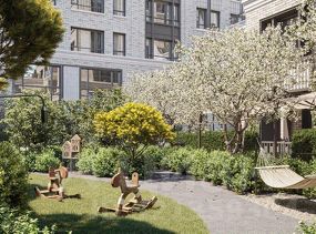 "Гудзон" устроен как замкнутый квартал из разноэтажных секций по периметру с приватным двором и общественным пространством. Во дворе нет машин и посторонних людей. Высотность здания от 3 до 17 этажей делает двор светлым и обеспечивает нужную инсоляцию квартир. Рядом с домом расположена большая детская площадка для жителей.