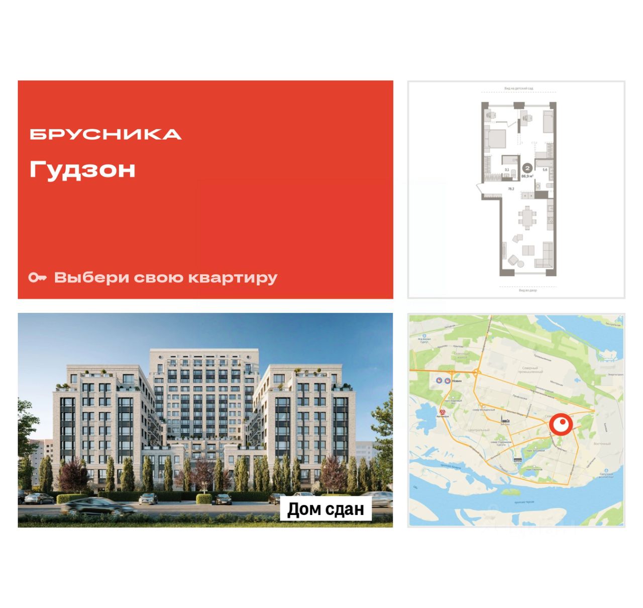 Квартира с кухней-гостиной и двумя спальнями в Гудзоне. Особенности планировки: окна на две стороны, второй санузел, окна в пол, вид во двор, свободная планировка.
