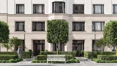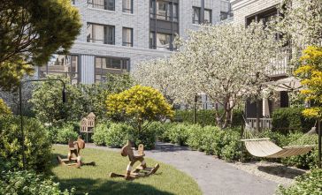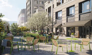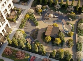 В проекте выражена идея интровертности здания: стены дома устроены вокруг внутреннего двора, который находится в центре композиции. Также здесь расположены две пешеходные арки, через которые осуществляется сквозной доступ во двор с улицы и главный вход в здание. Двор носит полуприватный характер и становится камерным лобби для жителей и гостей. Он полностью закрыт от машин. Во дворе высажены уже взрослые деревья, кустарники, цветы и злаковые травы, постелен газон. Растения размещены в грунте и дополнительно расставлены в вазонах. Во дворе предусмотрены места отдыха и прогулочные дорожки. Рядом с домом спроектирована большая детская площадка для детей разных возрастов с лестницами, горками и качелями, установлены уличные тренажёры для воркаута. #ZSBu1F