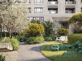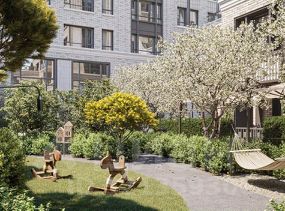 "Гудзон" устроен как замкнутый квартал из разноэтажных секций по периметру с приватным двором и общественным пространством. Во дворе нет машин и посторонних людей. Высотность здания от 3 до 17 этажей делает двор светлым и обеспечивает нужную инсоляцию квартир. Рядом с домом расположена большая детская площадка для жителей.