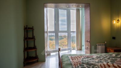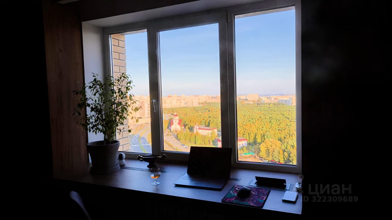 - Шикарный вид из окна: Панорамные окна и балкон открывают захватывающую панораму на зеленый массив парка и город, что создаёт атмосферу покоя и уединённости.