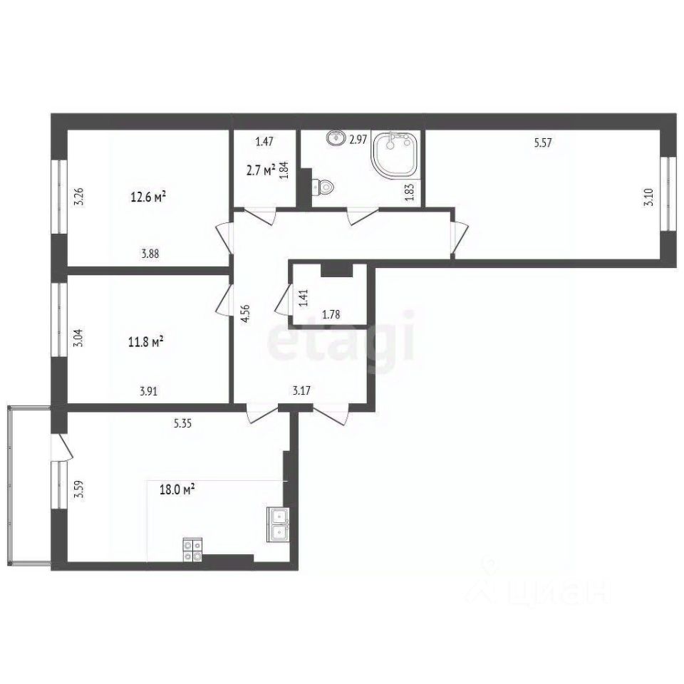 Квартира современной, продуманной планировки: просторная кухня-гостиная 18 кв.м.+ 3 отдельные уютные спальни и современный совмещенный санузел.