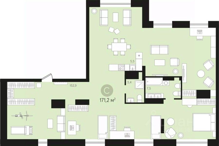 Продается однокомнатная студия с предчистовой отделкой в ЖК "Гудзон" на 17 этаже. Общая площадь: 171.24 кв.м., площадь гостиной 158.4 кв.м., из которых 5.5 кв.м. выделено под кухонную зону. Квартира - распашонка, без проходных комнат, окна выходят на paзные стороны дома. В квартире два совмещенных санузла. Высота потолков 2.72 м.