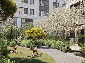 "Гудзон" устроен как замкнутый квартал из разноэтажных секций по периметру с приватным двором и общественным пространством. Во дворе нет машин и посторонних людей. Высотность здания от 3 до 17 этажей делает двор светлым и обеспечивает нужную инсоляцию квартир. Рядом с домом расположена большая детская площадка для жителей.
