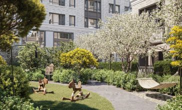 В проекте выражена идея интровертности здания: стены дома устроены вокруг внутреннего двора, который находится в центре композиции. Также здесь расположены две пешеходные арки, через которые осуществляется сквозной доступ во двор с улицы и главный вход в здание. Двор носит полуприватный характер и становится камерным лобби для жителей и гостей. Он полностью закрыт от машин. Во дворе высажены уже взрослые деревья, кустарники, цветы и злаковые травы, постелен газон. Растения размещены в грунте и дополнительно расставлены в вазонах. Во дворе предусмотрены места отдыха и прогулочные дорожки. Рядом с домом спроектирована большая детская площадка для детей разных возрастов с лестницами, горками и качелями, установлены уличные тренажёры для воркаута. #zm5FI1