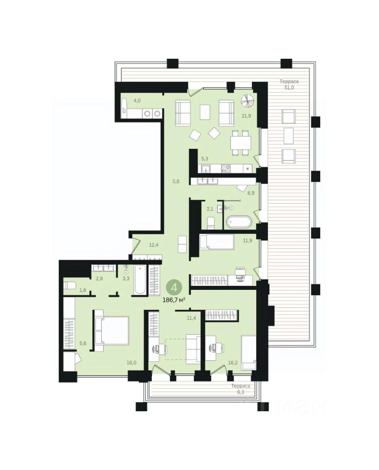 Продается 4-комн. квартира с предчистовой отделкой в ЖК "Гудзон" на 10 этаже. Общая площадь: 186.72 кв.м. Высота потолков 2.72 м.
