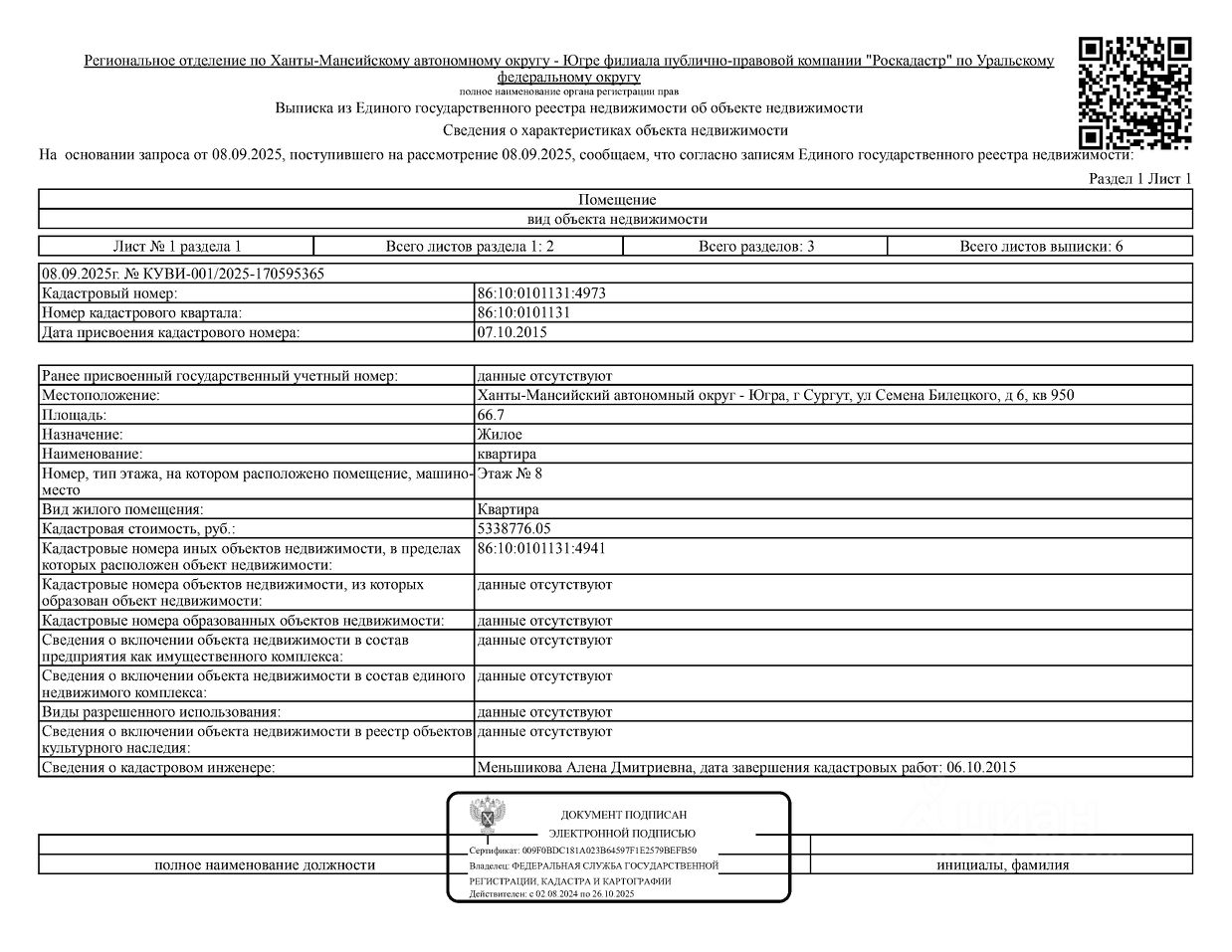 Должник: Идрисова Н.З., собственник: Идрисова Н.З. Лот: Жилое помещение (квартира), кадастровый номер: 86:10:0101131:4973, площадь 66,7 кв.м., г. Сургут, ул. Семена Билецкого, д.6, кв.950 (зарегистрировано 3 взрослых, 2 ребенка, задолженность за капитальный ремонт на 01.06.2025 - 74 т.р.), н/ц: 5304800 р., з-к: 5304 р., код: 0014, рег. 25-395;