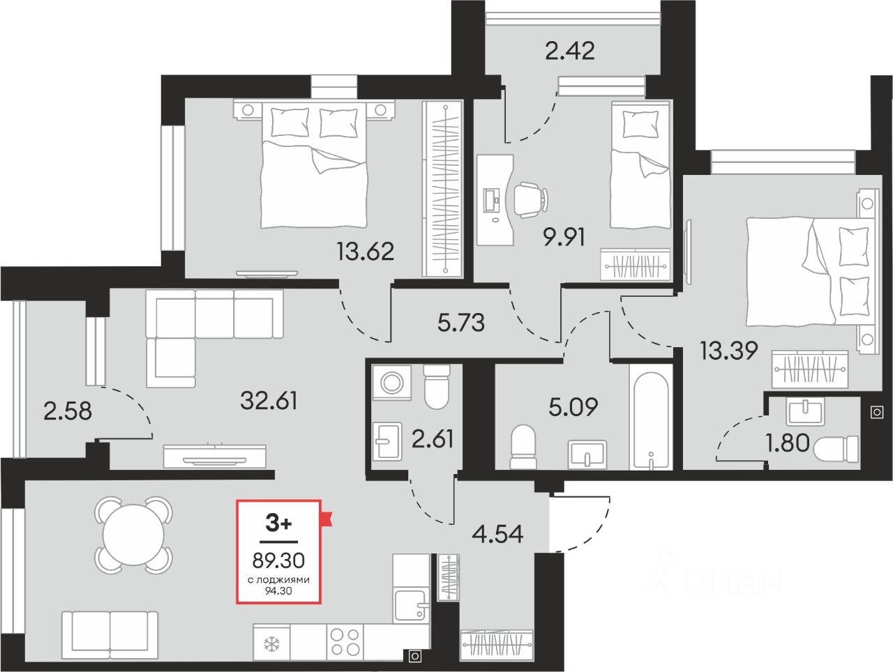 Общая площадь89,3 м²