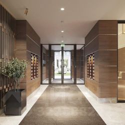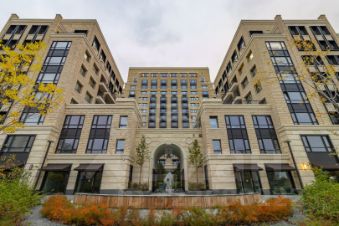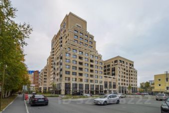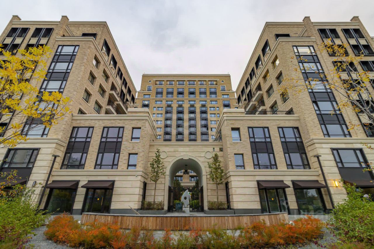 Дом спроектирован как замкнутый квартал с приватным озелененным двором, полностью свободным от транспорта и посторонних, с развитым общественным пространством в центре и детской площадкой. Фасадная отделка сочетает натуральный камень, кирпич и металл, формируя строгий и респектабельный архитектурный облик.