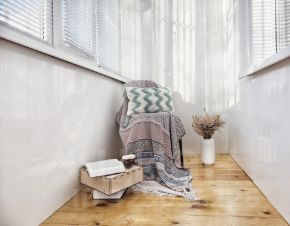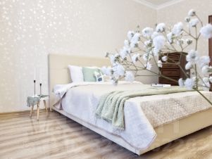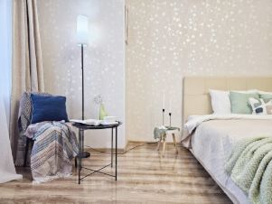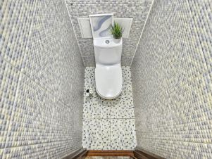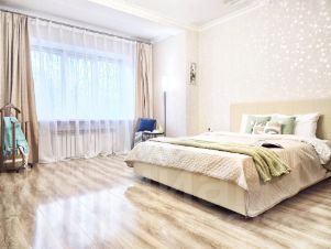 • В комнате — ламинат, в кухне, коридоре и санузлах — керамическая плитка.