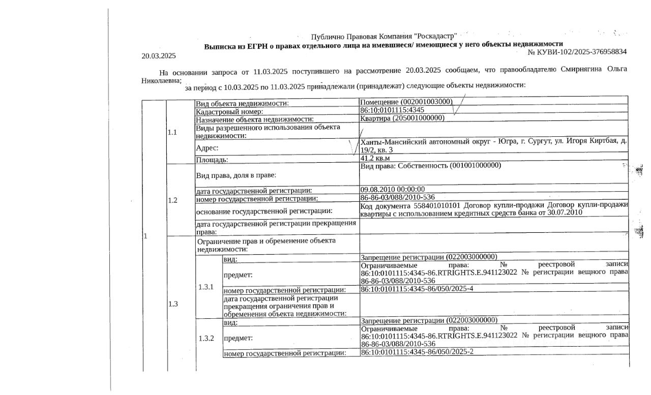 Должник: Смирнягина О.Н., собственник: Смирнягина О.Н. Лот: Жилое помещение (квартира), площадь 41,2 кв.м., кадастровый номер: 86:10:0101115:4345, г. Сургут, ул. Игоря Киртбая, д. 19/2, кв. 3 (задолженность по капитальному ремонту на 15.07.2025 - 117 т.р., зарегистрировано 2 взрослых, 1 ребенок), н/ц: 2350000 р, з-к: 2350 р., код: 0014, рег. 25-429;