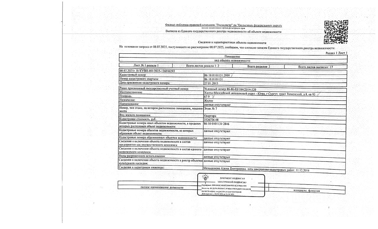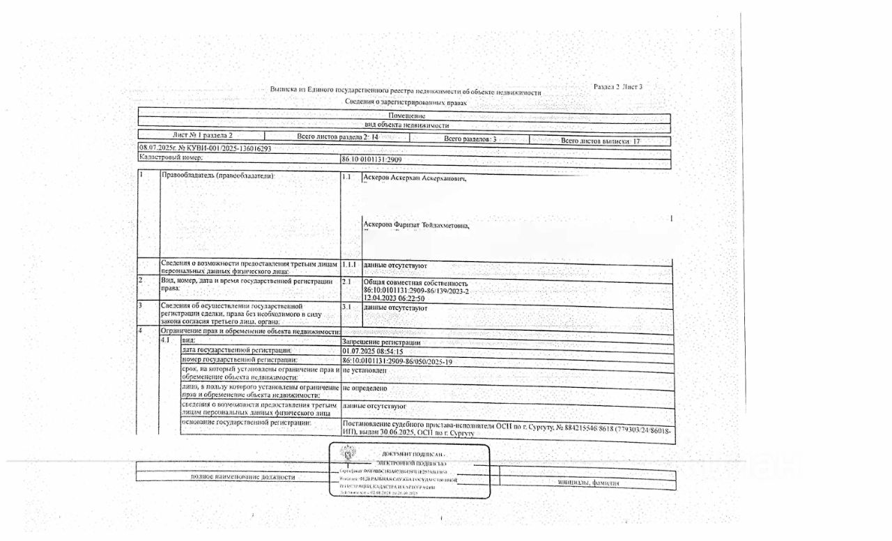 Должник: Аскеров А.А., собственник: Аскеров А.А., Аскерова Ф.Т. Лот: Жилое помещение, квартира, площадь 67,9 кв.м., кадастровый номер 86:10:0101131:2909, информация о зарегистрированных лицах отсутствует, задолженность за капитальный ремонт на 01.06.2025 - 24 т.р., г. Сургут, тракт Тюменский, д.8, кв.93, н/ц: 5270000 р, з-к: 5270 р., код: 0014, рег. 25-334