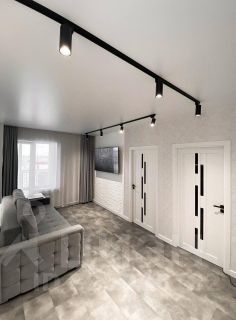 На полу кварц винил, в ванной комнате керамогранит. Стены оклеены обоями. Потолок натяжной. Использовался дорогой и качественный материал.