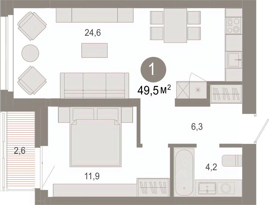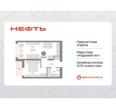 Квартира с кухней-гостиной и одной спальней в квартале "Нефть". Особенности планировки: гардеробная, лоджия, предчистовая отделка.