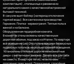 Просторная и светлая квартира после качественного евро ремонта предлагает комфортное проживание для всей семьи. В квартире выполнен качественный ремонт из качественных материалов, также в квартире имеется дорогостоящая мебель и бытовая техника.