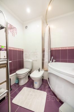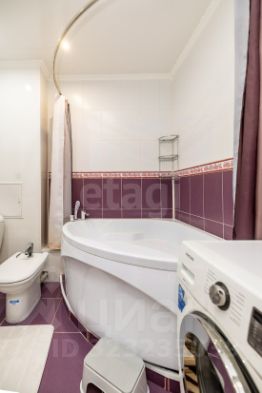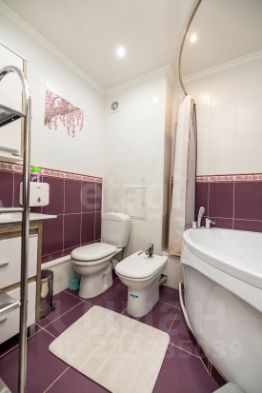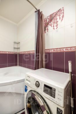 САНУЗЕЛ совмещённый: угловая ванна на постаменте с боковым смесителем, штанга, шторы, унитаз, биде фирмы ROCA(Испания), тумба с двумя выдвижными ящиками, раковина, зеркало, стиральная машинка автомат SAMSUNG на 6 кг., этажерка из нержавеющей стали для полотенец.
