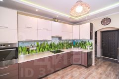 Шикарная кухня со встроенной дорогой техникой: духовой шкаф находится на уровне глаз, варочная панель, посудомоечная машина, вытяжка, холодильник и морозильная камера.