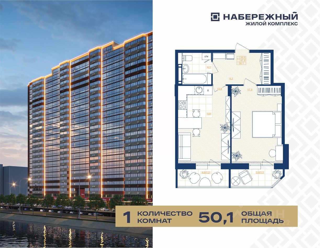 Продается уютная однокомнатная видовая квартира 43 площадью 50,1 кв.м. с большой лоджией и просторной кухней-гостиной площадью 18 кв.м., в жилом комплексе "Набережный". Общая площадь квартиры — 50,1 кв.м., жилая — 30,5 кв.м. Это идеальное место для комфортной жизни вашей семьи!