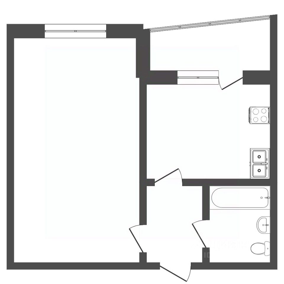 Просторная кухня-гостиная с выходом на балкон, большой и светлый зал, сан узел совмещен. В коридоре есть пространство, где можно оборудовать вместительную гардеробную.