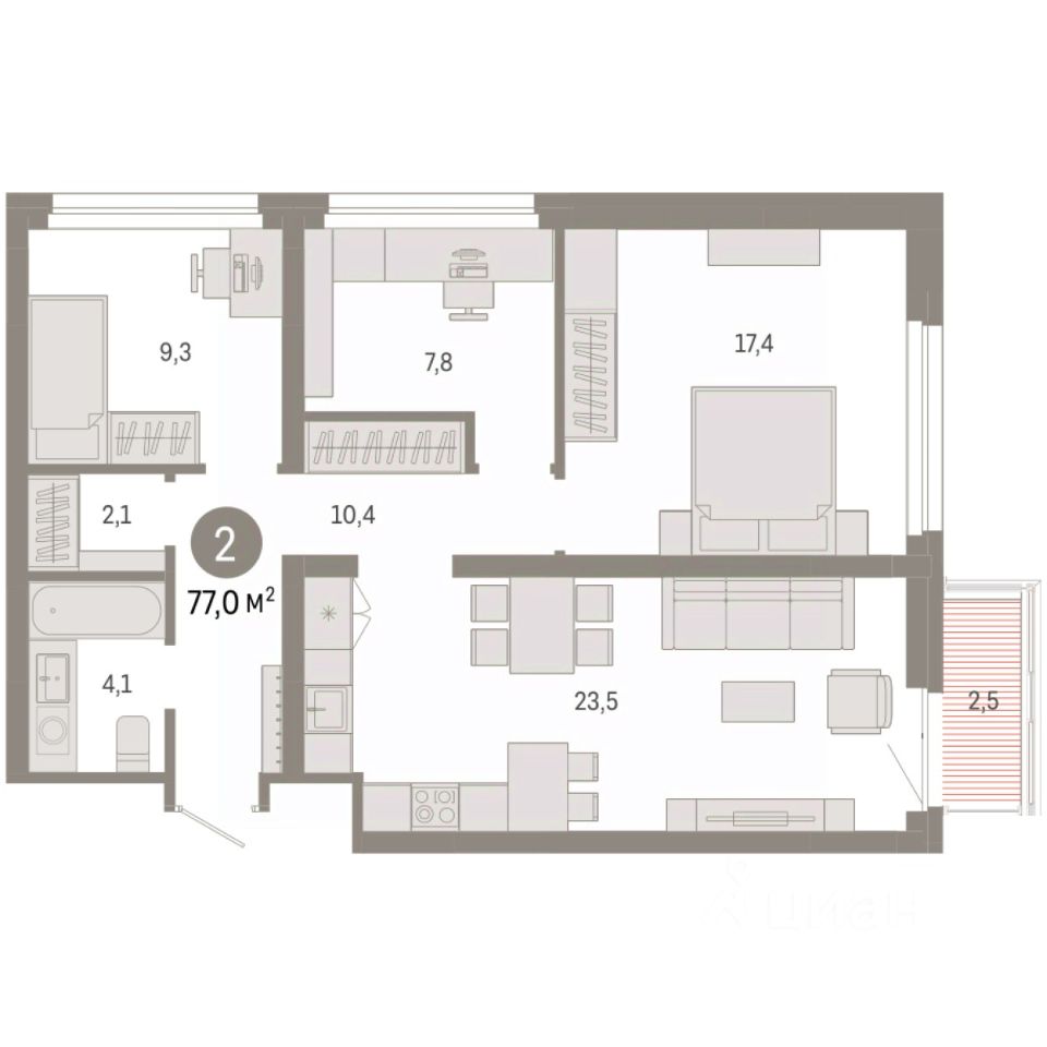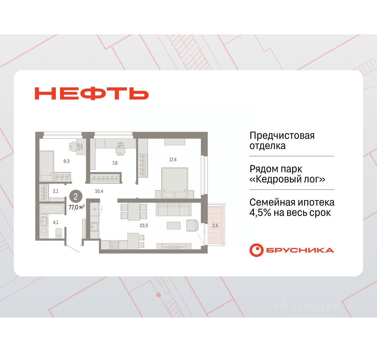 Квартира с кухней-гостиной и двумя спальнями в квартале "Нефть". Особенности планировки: гардеробная, рабочий кабинет, лоджия, разнесённые спальни, предчистовая отделка.
