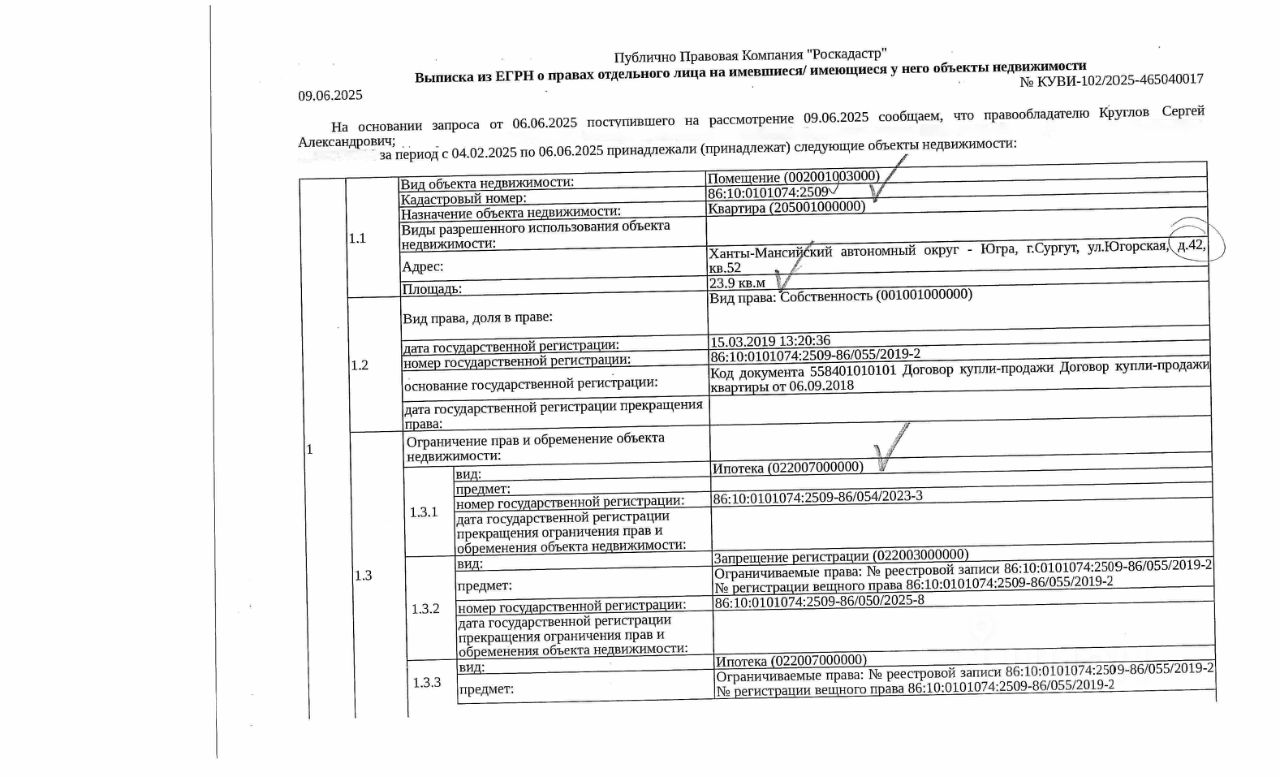 Должник: Круглов С.А., собственник: Круглов С.А. Лот: Жилое помещение (квартира), площадь 23,9 кв.м., кадастровый номер: 86:10:0101074:2509, г. Сургут, ул. Югорская, д.42, кв.52, (зарегистрировано 2 взрослых, задолженность за кап. ремонт на 06.06.2025- 23 т.р.), н/ц: 1700000 р., з-к: 1700 р, код: 0014, рег. 25-352;