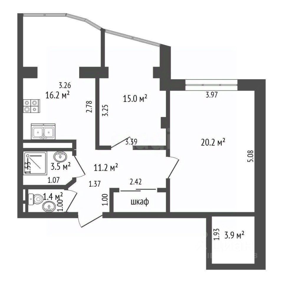 Окна расположены на две стороны, что позволяет получить достаточно естественного света и воздуха.