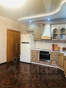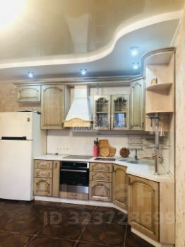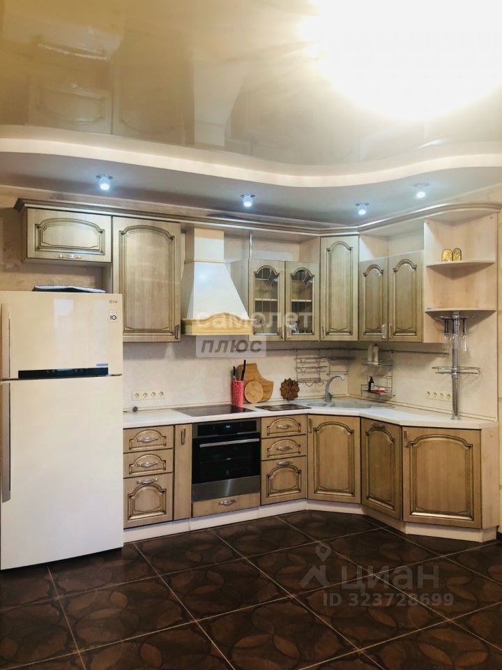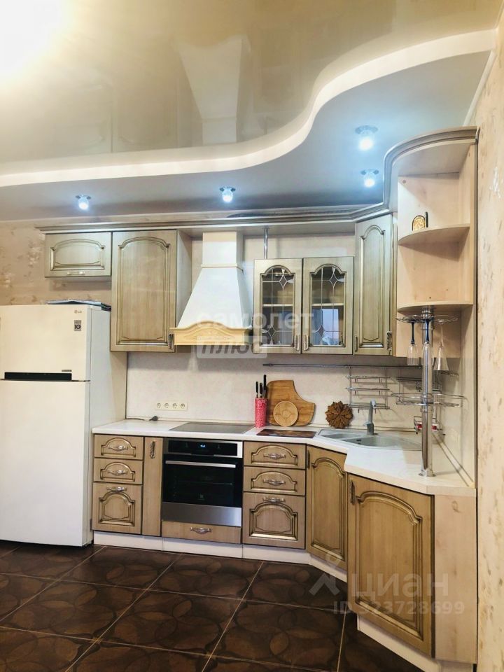 Кухня-гостиная очень просторная - 18,4 кв.м.! Установлен очень эргономичный гарнитур цвета светлого ореха со встроенной техникой - просто рай для хозяйки! Идеально разместится обеденный стол со стульями для уютных семейных обедов и званных ужинов! И уютный диван с ТВ в зоне отдыха.