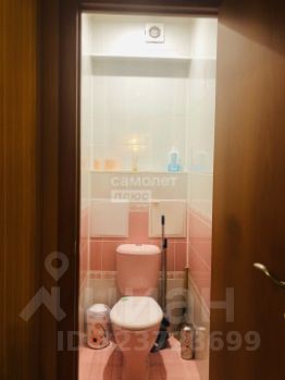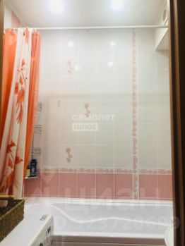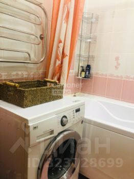 Санузел раздельный, облицован кафелем зефирно-кораллового цвета. Установлена стиральная машина, тумба с раковиной, зеркальный шкафчик.