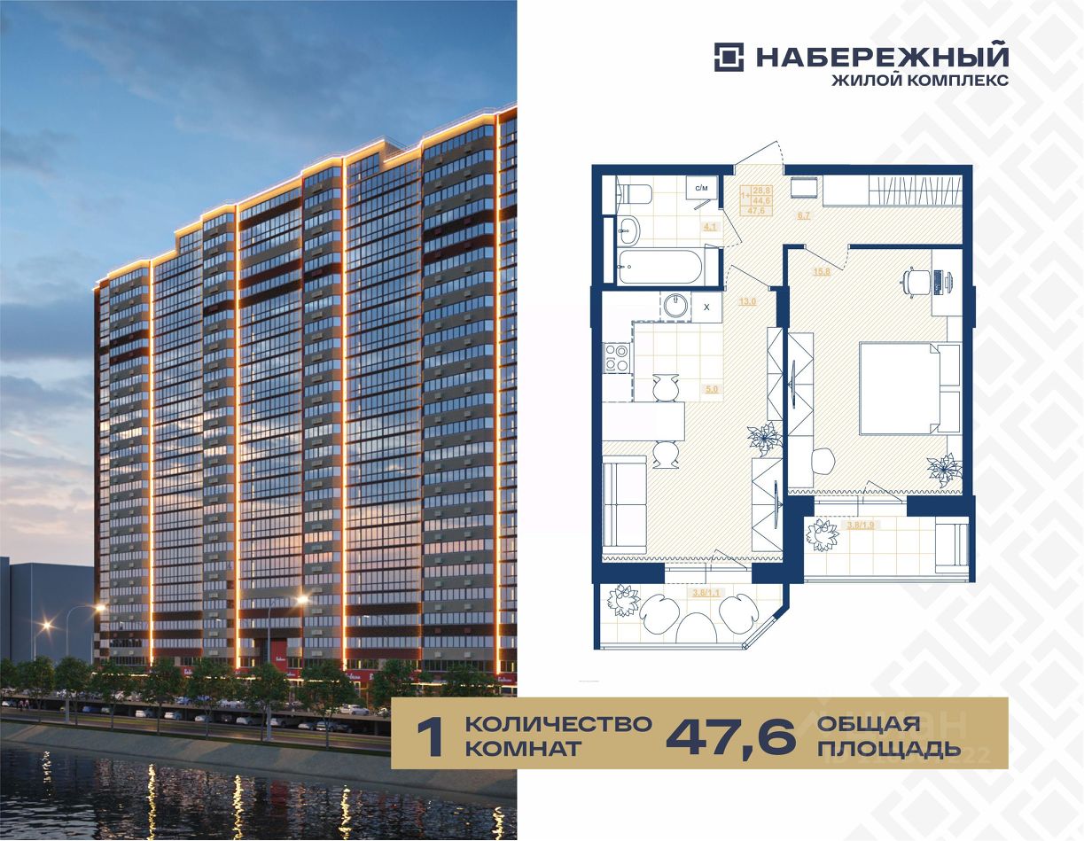 Продается уютная однокомнатная видовая квартира 368 площадью 47,6 кв.м. с двумя лоджиями и просторной кухней-гостиной площадью 18 кв.м., в жилом комплексе "Набережный". Общая площадь квартиры — 47,6 кв.м., жилая — 28,8 кв.м. Это идеальное место для комфортной жизни вашей семьи!